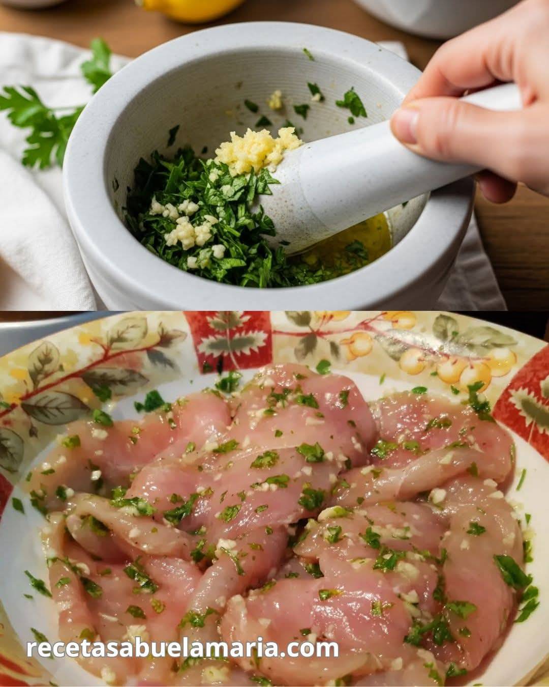 Esta receta de la abuela María nos enseña cómo aliñar carne de pollo utilizando ingredientes básicos, pero sabiamente combinados. El secreto está en dejar el pollo macerar el tiempo suficiente para que absorba todos los aromas y sabores, logrando una textura suave y un gusto irresistible.