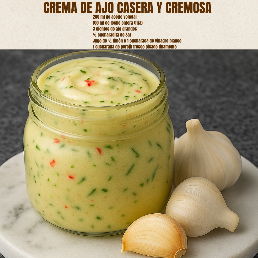 Esta crema de ajo es perfecta para acompañar carnes, papas, sandwiches o simplemente para untar en pan.