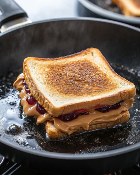 Este crujiente sándwich dorado de mantequilla de cacahuete y mermelada es una versión nostálgica del clásico sándwich de mantequilla de cacahuete y mermelada, perfecto para esas tardes acogedoras en las que quieres consentir a tu familia con algo especial. Es una forma deliciosa de convertir un simple sándwich en un capricho cálido y crujiente que encantará a todos. La combinación de cremosa mantequilla de cacahuete y dulce mermelada, envuelta en una corteza dorada, sin duda alegrará la mesa.