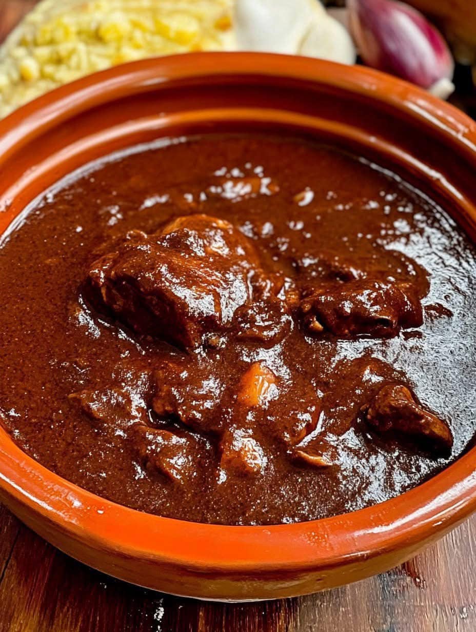 Coloca todos estos ingredientes en una licuadora o procesador de alimentos junto con la canela, los clavos, las pasas, la tortilla, el chocolate y el caldo de pollo. Licúa todo hasta obtener una mezcla suave.