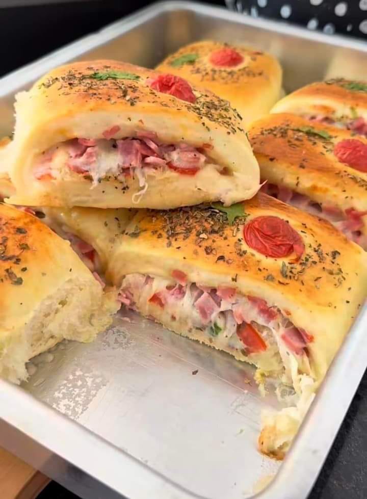 Este pan esponjoso y sabroso relleno con jamón, queso y tomate es perfecto para compartir en familia o con amigos.