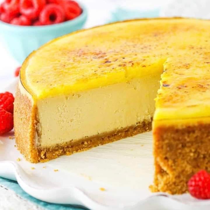 ¡Este pastel de queso Creme Brûlée está hecho con un pastel de queso cremoso de azúcar moreno, crema pastelera y azúcar caramelizada en la parte superior! ¡Es un giro divertido en el creme brûlée tradicional con mucho sabor!