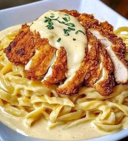 8. Sirve el pollo crujiente sobre la pasta cremosa, adornada con perejil fresco.